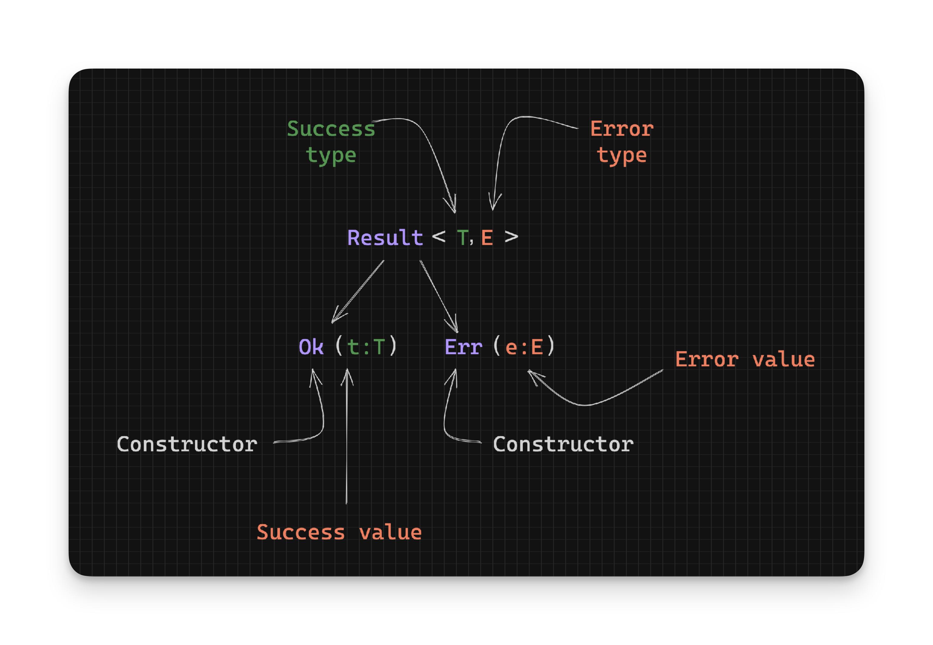 }You can think of Ok and Err as just wrappers around the actual values. That way if you see an Ok instance you know it has a success value wrapped “inside” it. Similarly when you get an Err instance, you know that it has an error value wrapped “inside” it. If you find this confusing, you can think of the Ok and Err constructors as “markers” indicating what the value they have is: either a success or error, respectively.