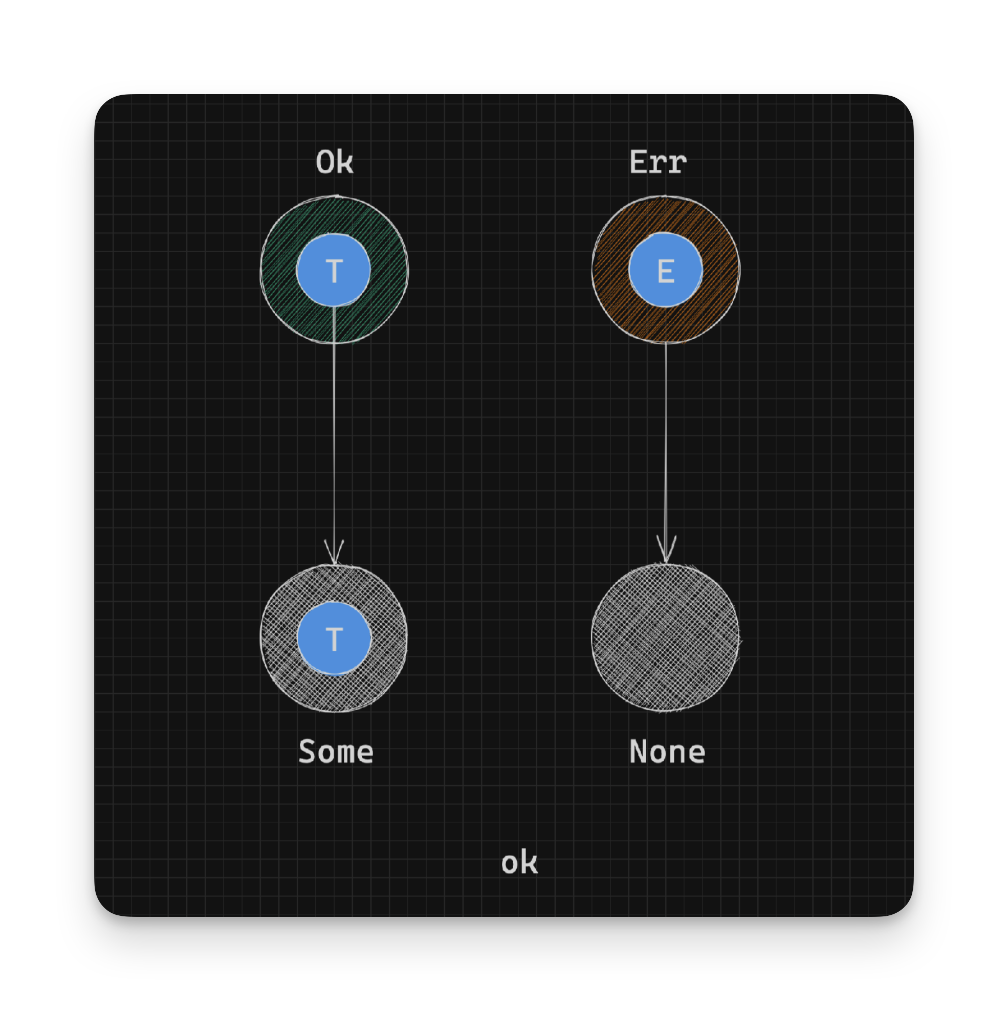 ok maps an Ok instance to a Some instance and an Err instance to a None: