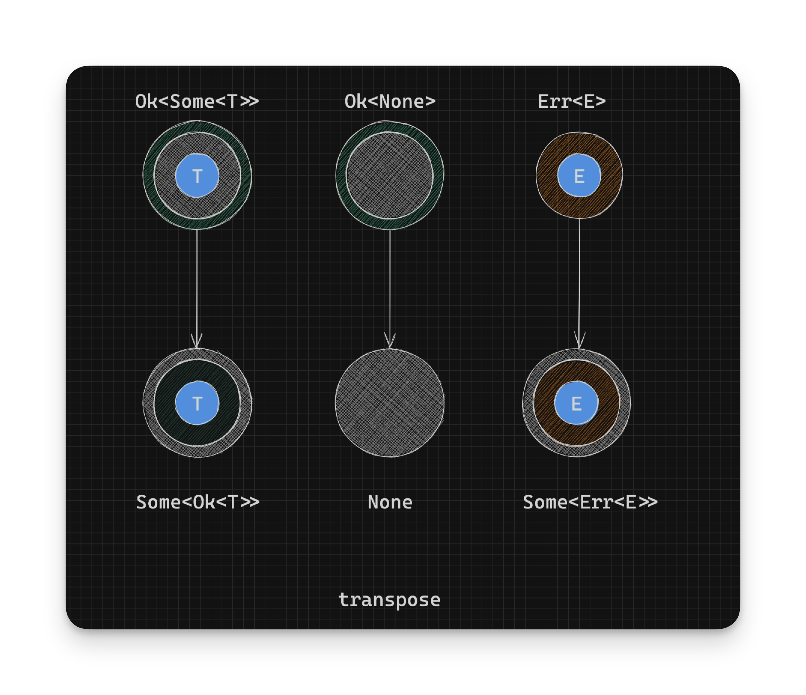 If we have a Result with a nested Option such as Result<Option<T>, E>, it’s useful to convert it to an Option with a nested Result such as Option<Result<T, E>>. We can achieve this with the transpose function which is defined as: