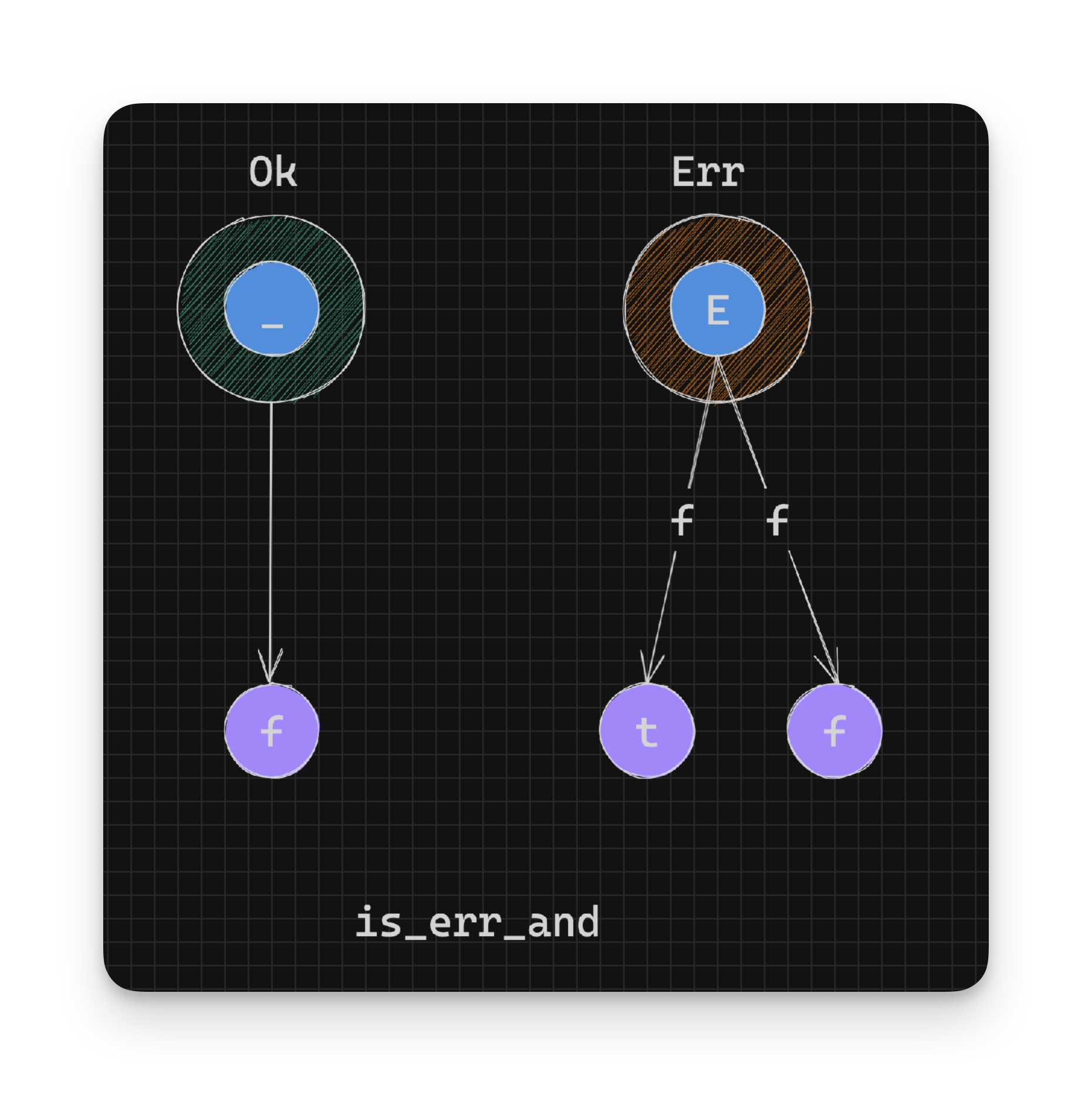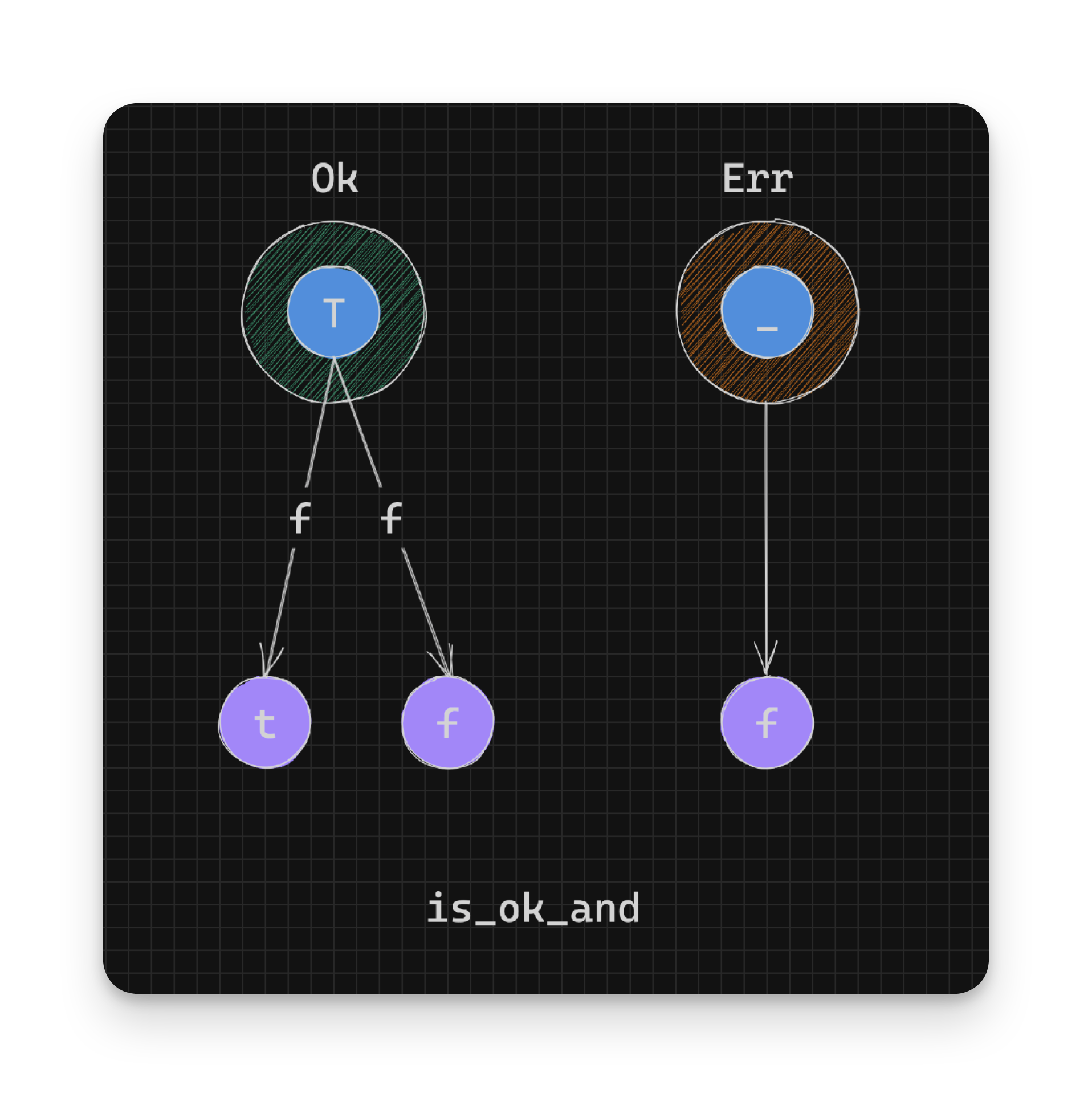 }In the above definition, the predicate function f is only called on the value inside the Ok instance, converting it to a boolean value. If the Result is an instance of Err the value false is returned.