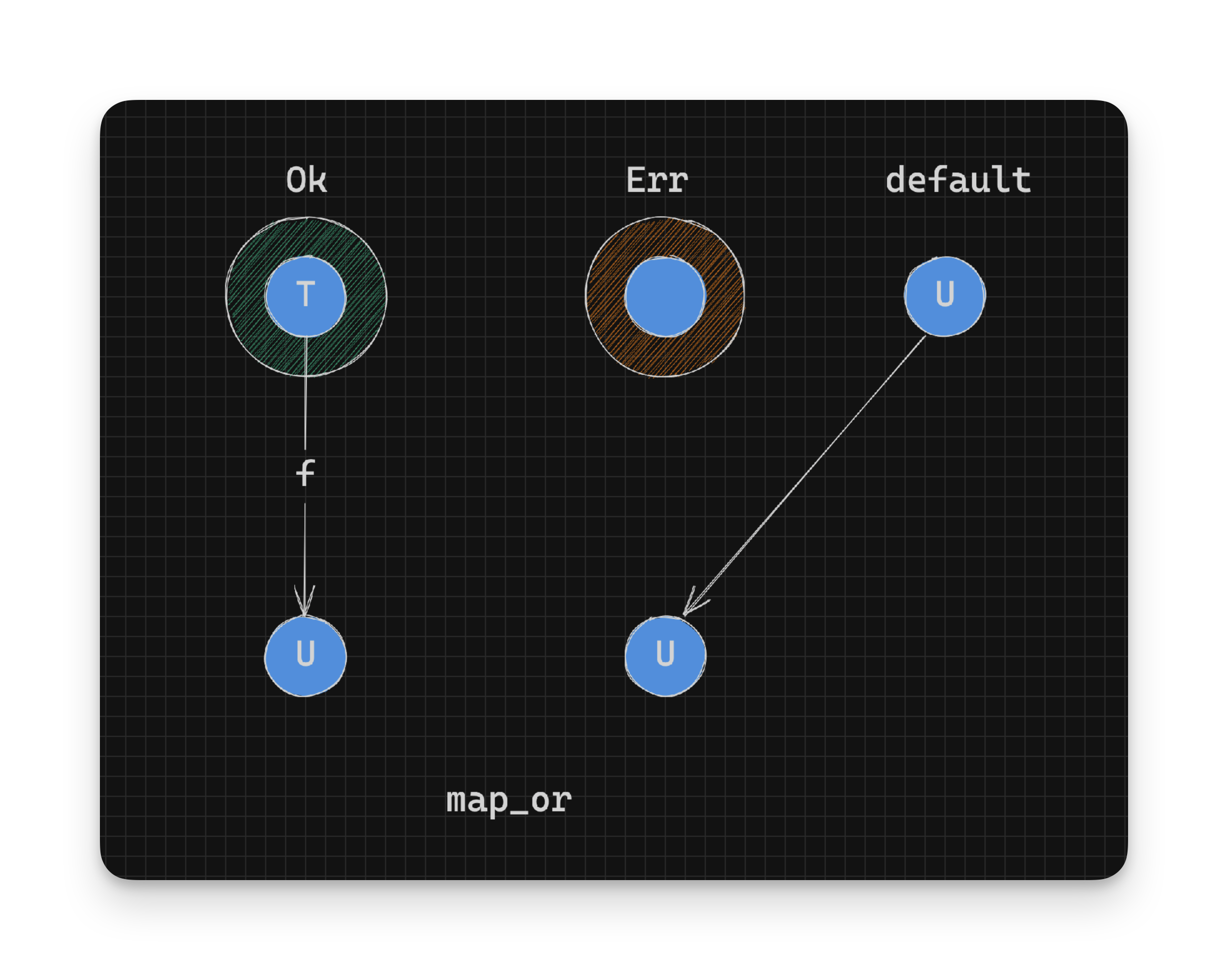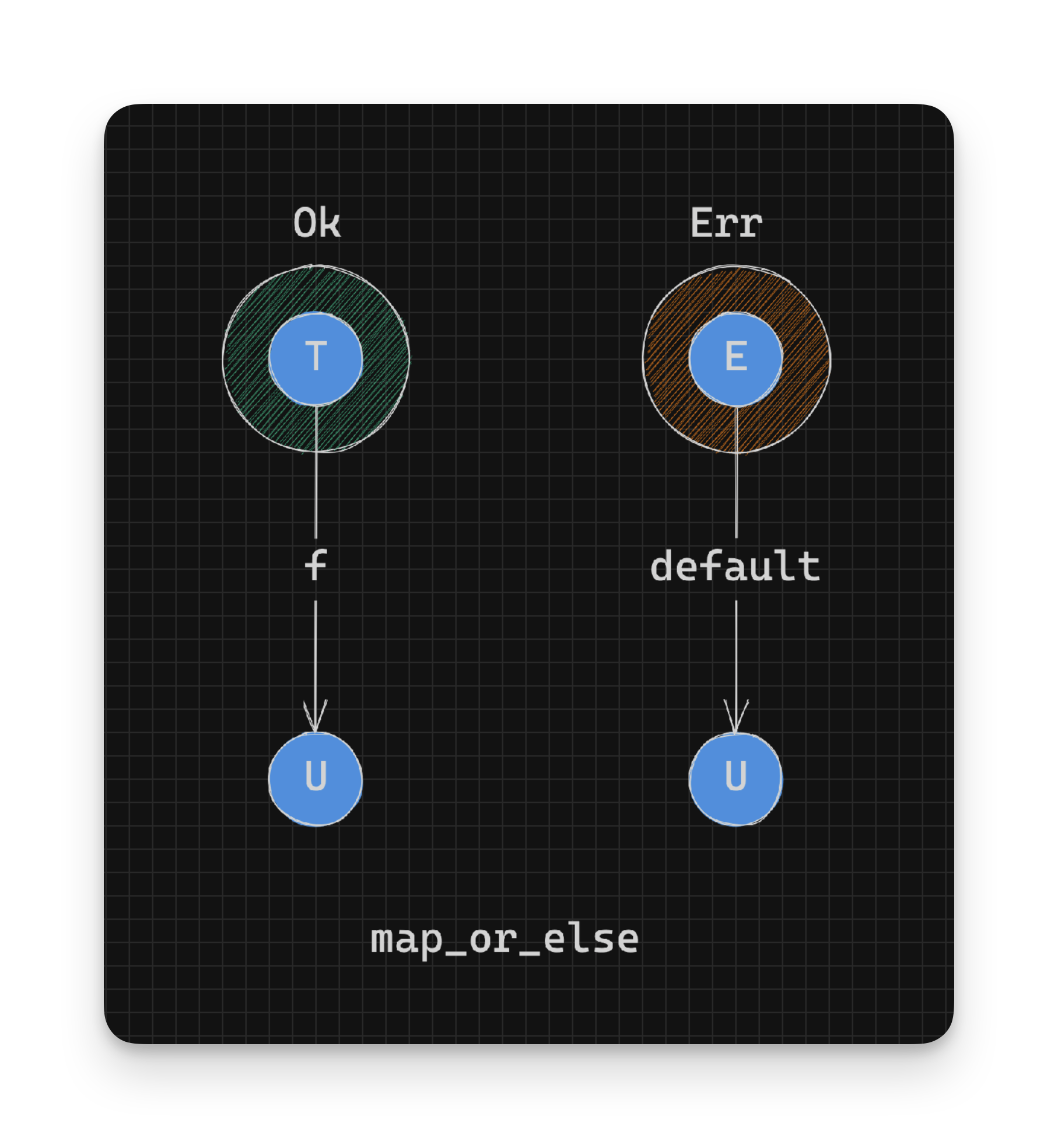 default: E -> U // Convert error value to a Udefault is used on the error value inside an Err instance and f is used on the success value inside an Ok instance. map_or_else has simply extracted the “wrapped” value in each constructor and run a function on each of those values to produce a result of the same type in all cases: U.